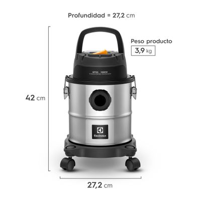 La Aspiradora de Agua y Polvo Electrolux GT12I combina máxima durabilidad con multifuncionalidad de limpieza gracias a su barril de acero inoxidable y su potencia de 1.500 W, ideal para todo tipo de suciedad, sólida o líquida (excepto inflamables). Su capacidad total de 12 litros permite limpiar eficientemente espacios interiores y exteriores.