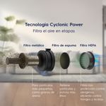 Con la Tecnología Cyclonic Power, filtra el aire en 3 etapas y, gracias al Filtro HEPA, puede retener micropartículas y ser eficiente contra ácaros y hongos. La filtración en 3 etapas también prolonga la vida útil de los filtros.